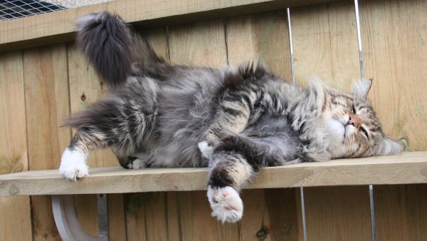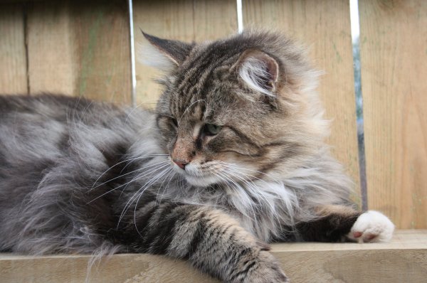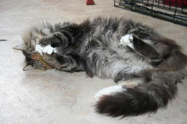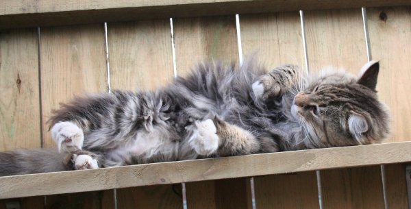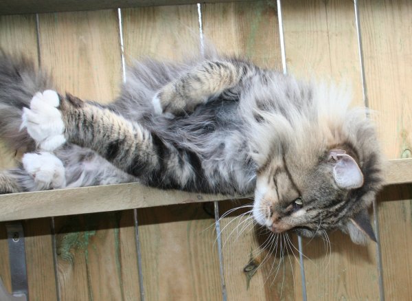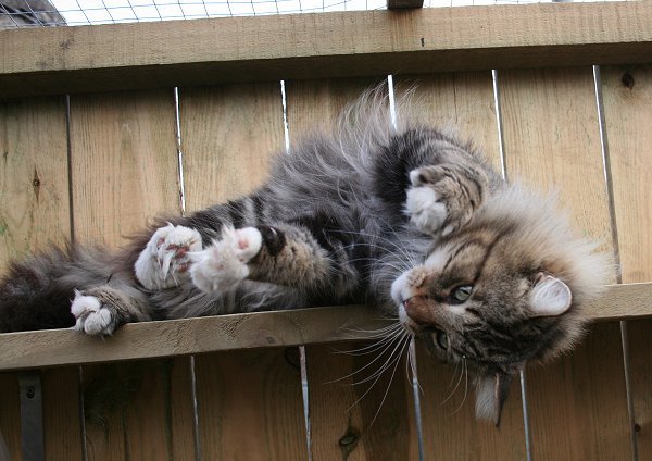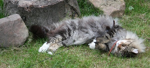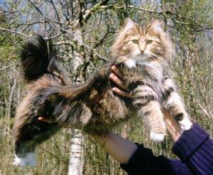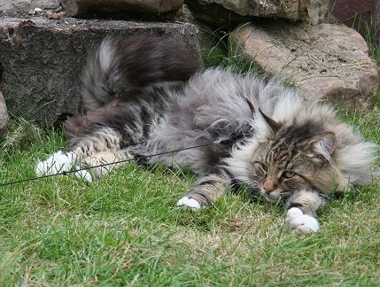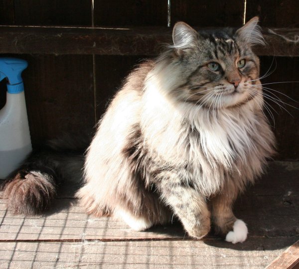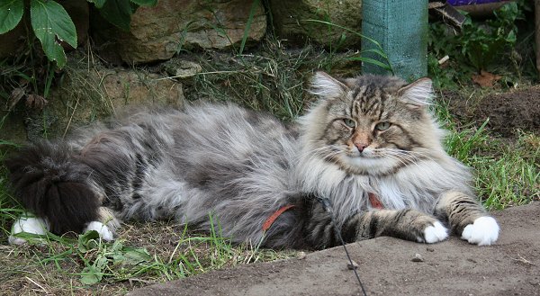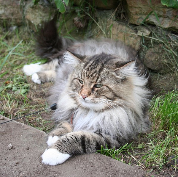 5th Generation forest cat imported from Denmark HCM Normal (August 2008) Odin was imported from Denmark. He attained his championship status in four shows and now holds one Grand Champion Certificate and a couple of Reserve's. Odin is outstanding quality and an excellent example of the old traditional type of this breed. Along with a very gentle and affectionate temperament he is a heavy boned very large boy. He is my pride and joy - his temperament is so sweet natured. He will give up his food for the queens and his kittens and he is very much involved with the socialising of his babies. He washes them and lays with them to keep them warm and when they are old enough to run around he teaches them the skills they need. It is lovely to observe. Odin is everything I wanted in a male cat and more. From a breeding perspective he proved his worth from the very first litter.He produces very big kittens no matter which queen he is mated with. Due to the old Norwegian lineage of his pedigree has hardly been used along with his father Gismo 00-21 in Denmark, his lines will be protected. Odin has always been closed stud however given his age now we may well change this status sometime this year to invitation only for tested and screened queens.