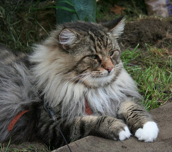 September 2009 - aged 9 1/2 years old and out on his harness watching erection of the new cat gardens.